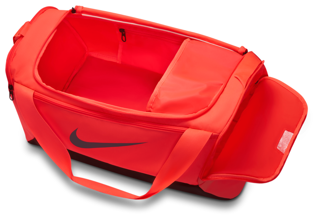 Dump everything you need in the Nike Brasilia Small 9.5 Duffle Bag and get going. Designed with a side compartment that stores belongings separately, this bag helps you stay organized. Its zippered main compartment secures training essentials, while the inner compartment can store dirty and sweaty gear. The coated bottom helps shield your things from bumps, scrapes, and spills, and the outer pockets keep must-haves within reach.