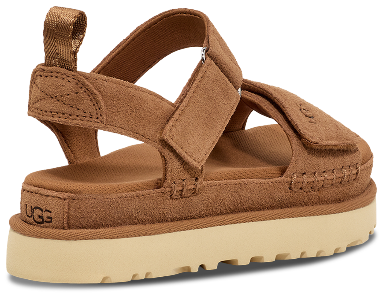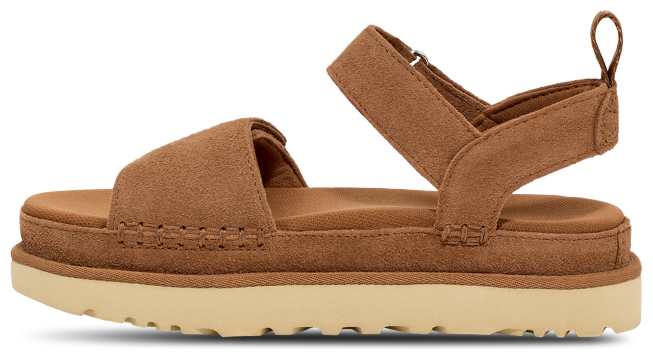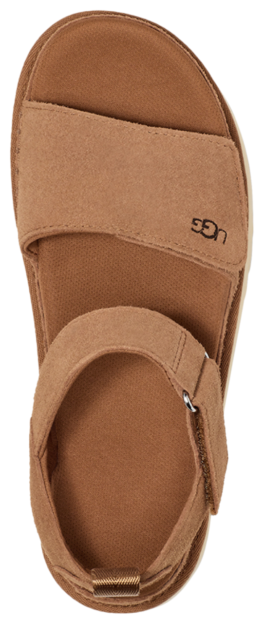 Be the star of your universe by adding easy-going comfort and ease to your casual looks with the UGG Goldenstar. Constructed with a suede upper, these sandals feature textile lining made from 100% recycled polyester fibers that offer eco-conscious fashion and a feel-good fit. The 100% recycled polyester rear pull tab enables easy on and off, while the sugarcane EVA midsole made with recycled EVA regrind adds cushioning to every step. Boasting a heat-embossed UGG logo, the UGG Goldenstar lets you enter the Goldenstar fan club in a head-turning style.